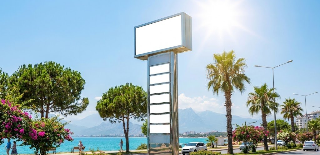 Antalya pilon tabela, yoğun araç ve yaya trafiğine sahip bölgelerde markaların uzaktan f...